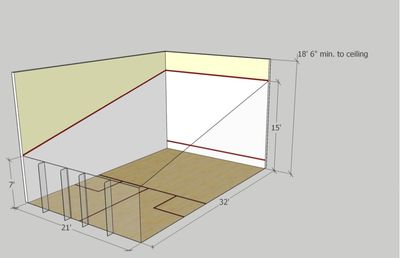 3.5 Playing Lines for a Convertible Court (diagram) 3.1 Application. 3.1.1 All court markings are recommended to be 1½" (38mm) wide and colored bright red. On convertible courts utilizing a moveable glass back wall, the recommended color is either black or bright blue. 3.1.2 All court markings shall be straight to within plus or minus 1/ Squash Court Diagonals: 11665 mm plus or minus 25 mm Building a squash court requires you to erect four solid playing walls (1x front, 2x side walls,1x back wall). All playing walls of the court shall have a hard smooth finish. The diagram opposite shows a regular squash court. All of the squash lines except the service line are relevant to Racketball. A Racquetball Court The ceiling and left side wall removed for clarity. A racquetball court is marked by the following lines: