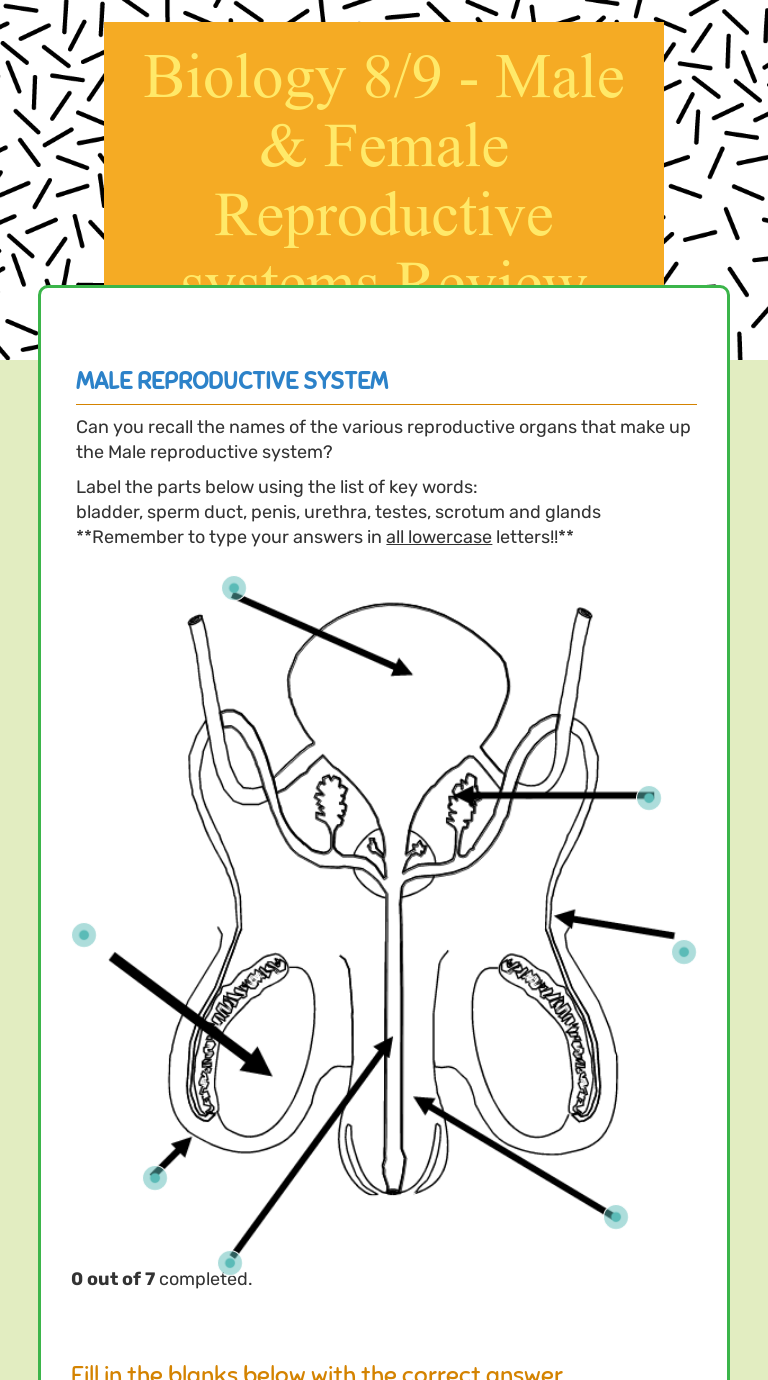 Male reproductive system worksheet Reproductive system online worksheet for grade 6. You can do the exercises online or download the worksheet as pdf. ID: 739350 Language: English School subject: Natural Science Grade/level: grade 6 Age: 11-14 Main content: Reproductive system Other contents