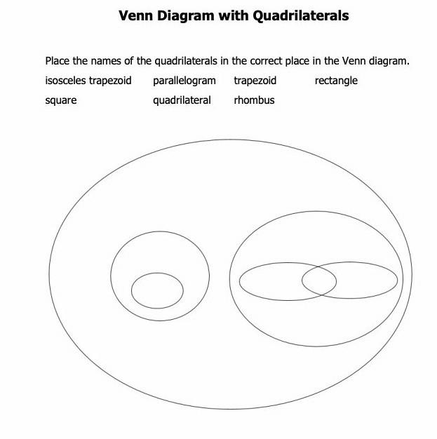 Venn diagram - Wikipedia A Venn diagram consists of multiple overlapping closed curves, usually circles, each representing a set. The points inside a curve labelled S represent A Venn diagram in which the area of each shape is proportional to the number of elements it contains is called an area-proportional (or scaled) Venn... Easily Solve Math: Solving Online Venn Diagram of Quadrilaterals We know that on combining three non-collinear points in pairs, the figure obtained as a triangle. Now, let us mark four points and see what we obtain on combining them in pairs in some order. Such a figure created by combining four points in an order is called quadrilateral. What is a Venn Diagram and How to Make One in Visme A Venn diagram is a diagram made of two or more circles that overlap with each other to show similarities between the properties represented in the circles. Each circle in the graphic organizer is called a set. The intersection point or the area where the circles meet is called a union. Venn Diagram Of Quadrilaterals Worksheets - Printable Worksheets Showing top 8 worksheets in the category - Venn Diagram Of Quadrilaterals. Some of the worksheets displayed are Regular polygons quadrilaterals, Performance based learning and assessment task properties, Properties of quadrilaterals, Fifth grade mathematics constructing task...