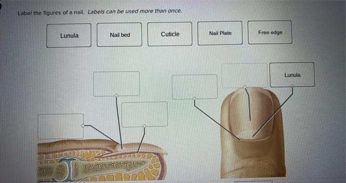 Nail Diagram Diagram | Quizlet Created by roboticpigeon Terms in this set (6) Cuticle The nonliving epidermis that surrounds the edges of the fingernail and toenail. Lunule The crescent shaped white area on a nail. Free Edge Part of the nail which extends past the flesh of the finger or toe. Nail Bed The supporting skin under a nail. Nail Matrix NAIL ANATOMY - Different Parts of Fingernail - Bliss Kiss ... Nail Plate Composed of hardened, flat, translucent, non-living, keratin nail cells that form a solid, protective layer over the underlying soft tissue. The nail plate should NOT be confused with the nail "bed". The average person has 50 layers of keratin cells that make up the nail plate. Anatomy 2017- Unit 2 Label the Nail Diagram Diagram - Quizlet Anatomy 2017- Unit 2 Label the Nail Diagram STUDY Learn Write Test PLAY Match + − Created by eileenbergman Terms in this set (14) Free edge of nail ... Lateral nail fold ... lanula ... Eponychium (cuticle) ... Nail matrix ... Root of nail ... Proximal nail fold ... Body of nail ... Nail bed ... Body of nail ... Eponychium (cuticle) ...